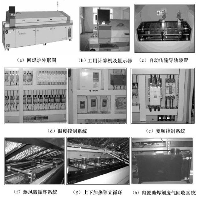 回流炉内部结构主要包括有加热系统、传动系统、冷却系统和控制系统等。外部机构有电源开关、信号指示灯、设备操作接口、紧急开关、抽风散热系统和传输系统等。