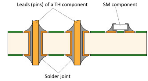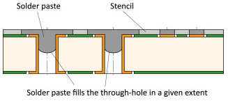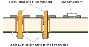 在把锡膏顺利印刷到镀通孔后,自动放置机会拾取通孔插装元件插入通孔中。通孔元件的引脚撕裂镀通孔中的锡膏,并将一部分锡膏膏推到底部。底部的锡膏在回流熔融时会通过毛细作用流回镀通孔中,从而完全填充镀通孔内部。