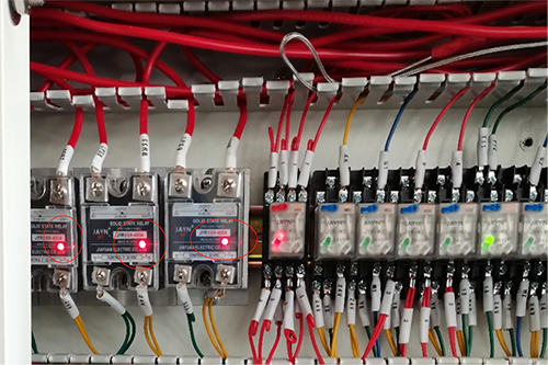 3、检查设备的控制部分,对加热进行检测和控制。固态继电器是否有输出,如果不确定,用相邻温区的继电器切换,判断继电器是否有故障。