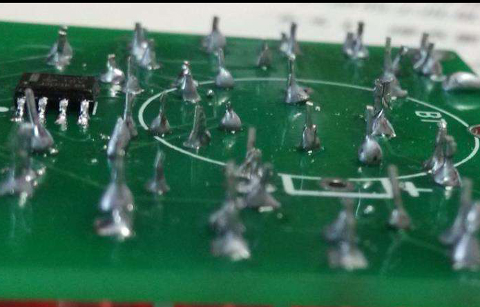 拉尖大多发生在PCB铜箔电路的终端。PCB经过波峰时,PCB上的液态料下坠受到限制时就会出现此现象。在高频、高压电路中,尤其需要注意此类缺陷的危害。