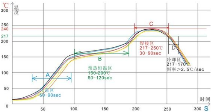 1,分析曲线:首先拿到客户要求的曲线图,如果没有需参照锡膏供应商提供的曲线图,然后分析其温度曲线升温区,恒温区,焊接区,冷却区各个温区的峰值及持续时间。