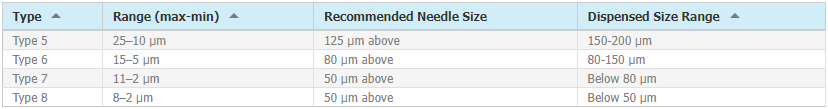 针头内径至少是焊料颗粒大小的五倍才能有效避免出现堵塞问题。常见的锡膏颗粒大小和针头大小关系如下: