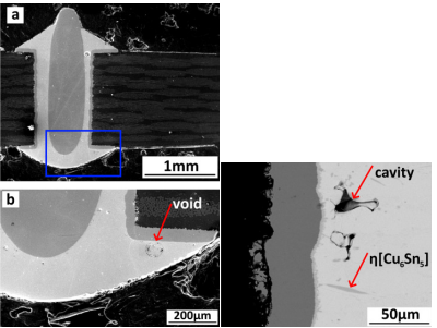 所有通孔内的电阻器引脚均被无铅SAC305焊料完整包裹。经过SEM观察后发现电阻器J1的焊点几乎没有空洞,意味着焊点的强度保持良好。铜表面和焊料之间形成了致密的IMC层(Cu,Ni)6Sn5,且厚度均在2.5-3.5μm的范围。集成电路K1-K3在焊后可靠性也可接受,铜表面同样形成了(Cu,Ni)6Sn5层。