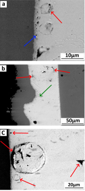 图2. 电阻器J1 (a, b)和J3 (右) 的焊点SEM图。