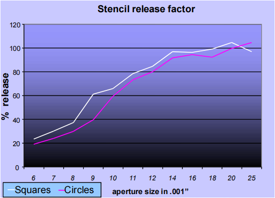 测试数据表明,对于小孔径,方形孔表现要比圆形孔要好,如下图所示(结果来自于一个0.005”的电铸钢网)