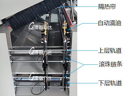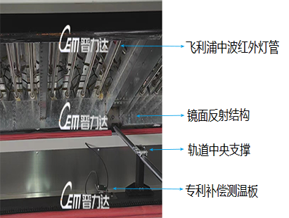 1 双层导轨结构,上下层闭环单独控制,上层报警不影响 2 采用进口飞利浦中波红外线灯管,配合镜面反射板, 下层工作; 专利板面测温补偿模 式,实测温度精度高