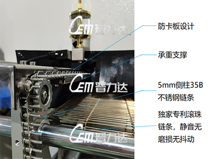 ●独家专利承重型滚珠链条传动,并配承重支撑,不产生金属粉末,满足千级无层车间要求