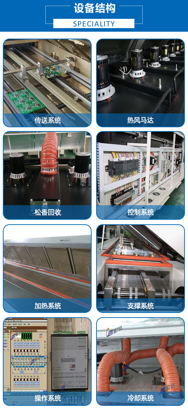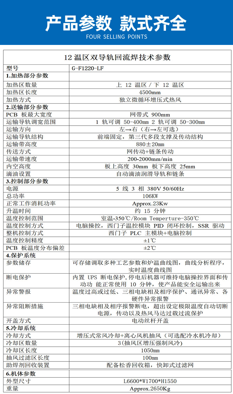 ● 独立控制的冷却系统,进口不锈钢制作,上下冷却对流,冷却后的曲线与焊接温度曲线成镜像,完全符合SMT国际认证标准