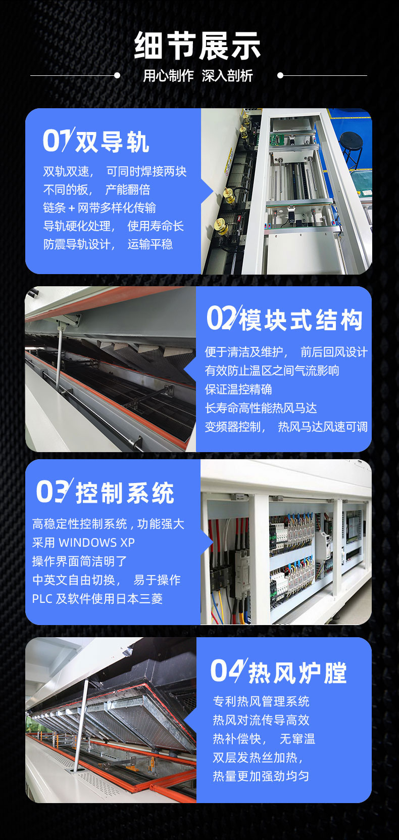 ● 各温区采用双热风通道强制独立循环,独立PID控制,上下独立加热方式,使炉腔温度准确,均匀,热容量大;双热风通道加热方式, 解决了香蕉视频下载污焊接时的死角难题.适合CSP、BGA、0201CHIP等电器元件的焊接.